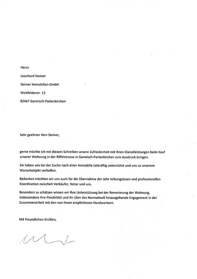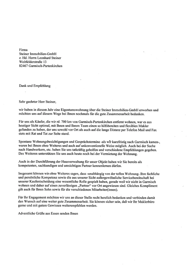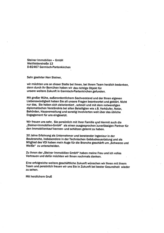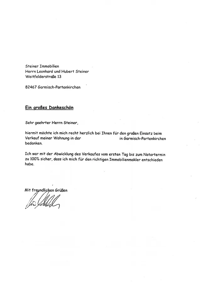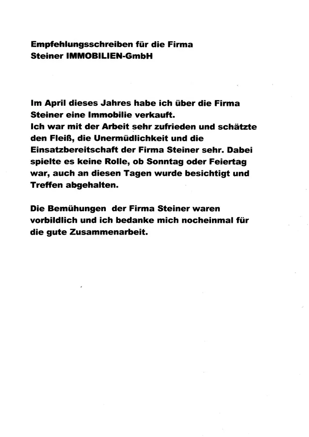 … Wir freuen uns sehr, Sie persönlich mit Ihrer Familie und hiermit auch die „Steiner IMMOBILIEN GmbH“ als einen ausgesprochen zuverlässigen Partner für den Immobilienkauf kennen- und schätzen gelernt zu haben …